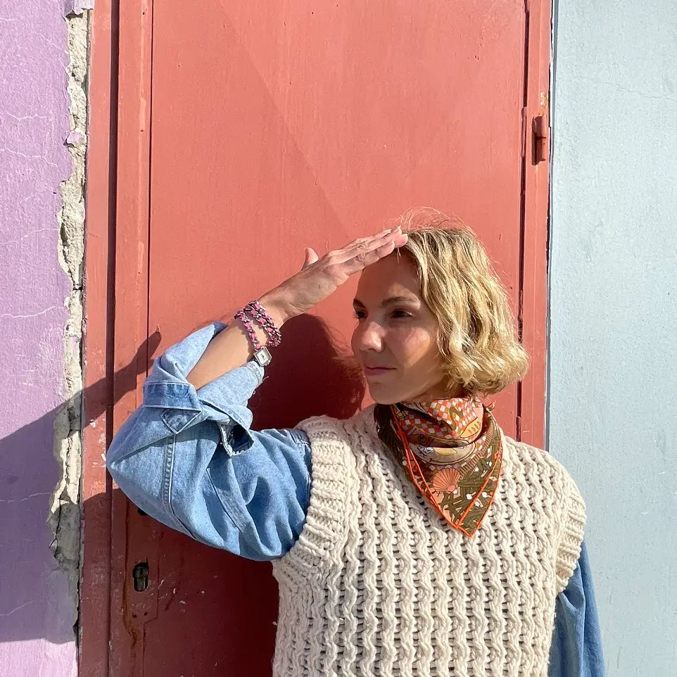 Chaque bandana est une œuvre d’art unique, illustrée à la main par Acilay Meric. Fabriquée en crêpe de soie de 55 x 55 cm, elle combine élégance et respect de l’environnement. Produite en petites quantités dans la ville natale de l’artiste en Turquie, cette écharpe est réalisée de manière éthique, avec des bords roulés à la main pour un fini raffiné. Livrée dans une pochette 100 % coton, elle vous accompagne avec soin au quotidien.