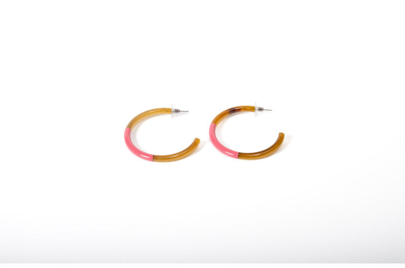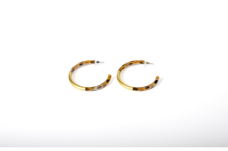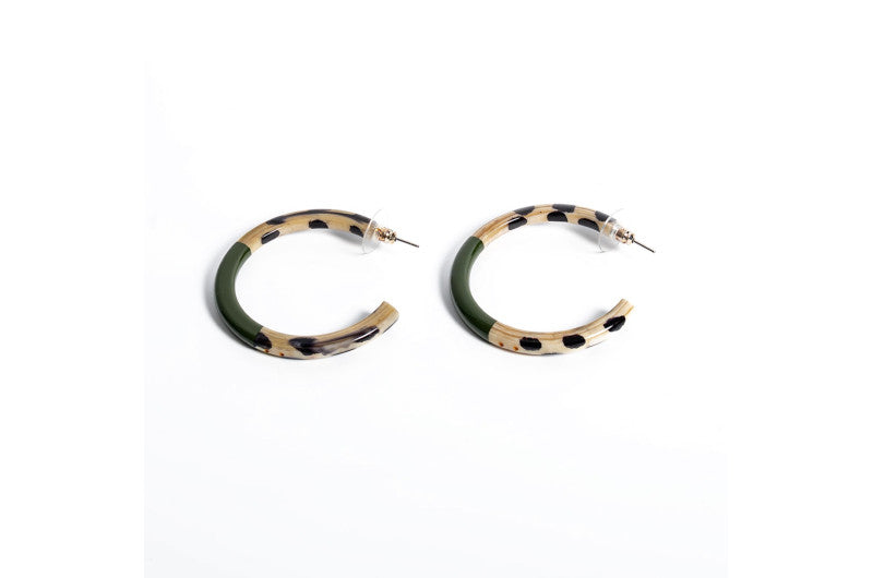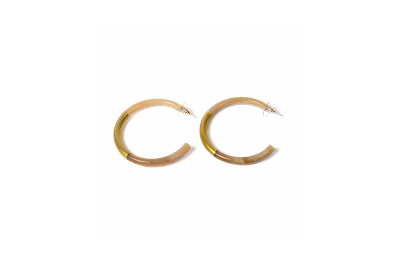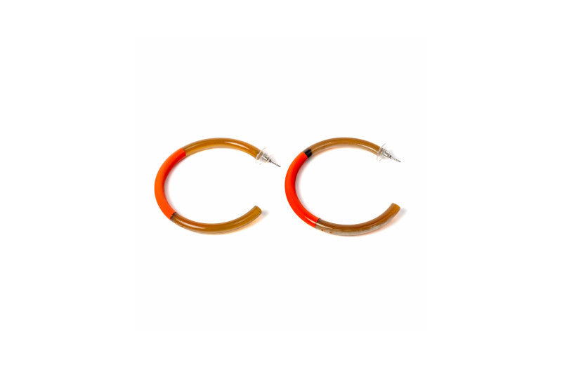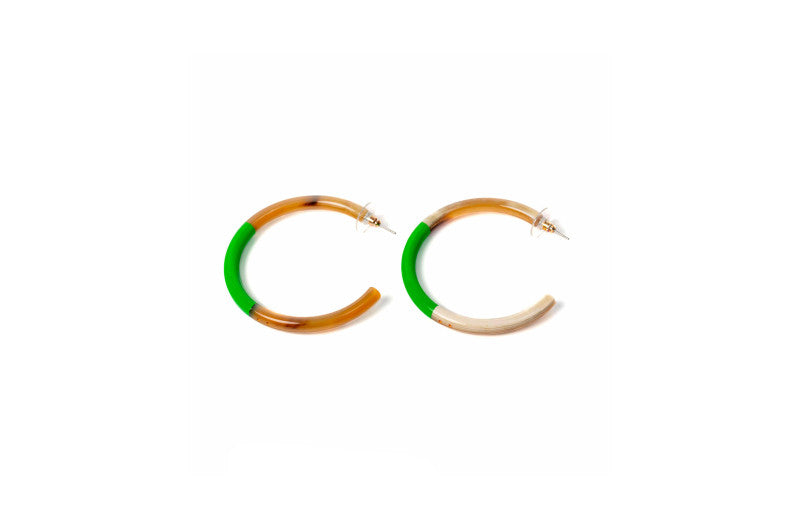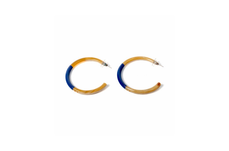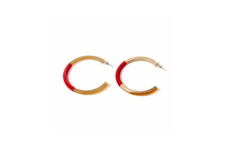Boucles d'oreilles artisanales en corne naturelle, signées ATELIER1811. La partie centrale de chaque paire est laquée de couleur, révélant la belle teinte naturelle de la corne en haut et en bas. Montées sur clous en acier inoxydable hypoallergénique. Chaque création est unique : les deux boucles d'une même paire peuvent présenter de subtiles variations de couleur ou de texture, témoignant de leur fabrication authentique et de leur caractère artisanal. Un accessoire qui célèbre l'unicité et la nature.
