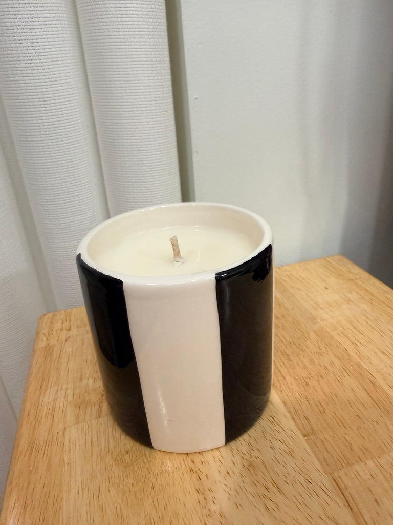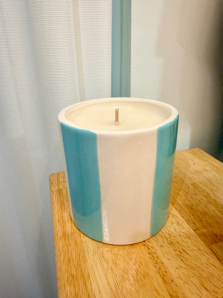 Offrez-vous une ambiance chaleureuse avec notre bougie artisanale à rayures rechargeable ! La cire de soja assure une combustion propre et une diffusion optimale de la fragrance.