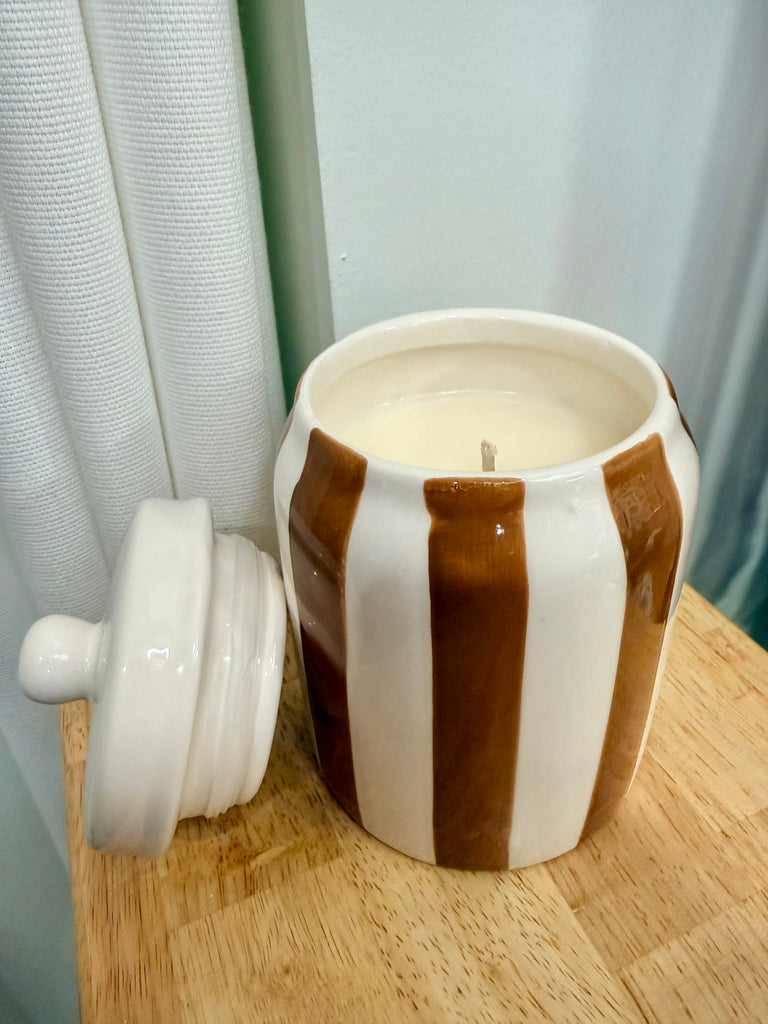 Découvrez notre bougie pot à rayures, un véritable objet de décoration pour votre intérieur. Ses larges rayures noisette créent une ambiance chaleureuse et apaisante dans n'importe quelle pièce. Dotée d'un couvercle en céramique élégant, elle se transforme en accessoire de rangement pratique une fois la bougie consumée. Parfaite pour créer une atmosphère cosy chez vous, cette grande bougie allie style et fonctionnalité.