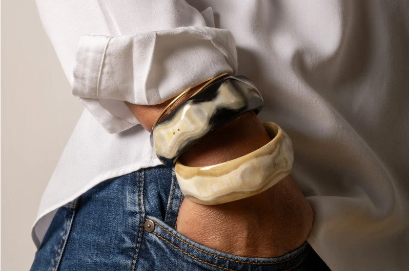 Bracelet BARNABÉ en corne naturelle aux facettes travaillées à la main. Chaque pièce révèle un design sculptural unique, où la lumière danse sur les surfaces taillées avec soin. Hauteur de 2,5 cm pour un port confortable et élégant. Un accessoire intemporel qui célèbre le savoir-faire artisanal et la beauté brute de la matière naturelle.