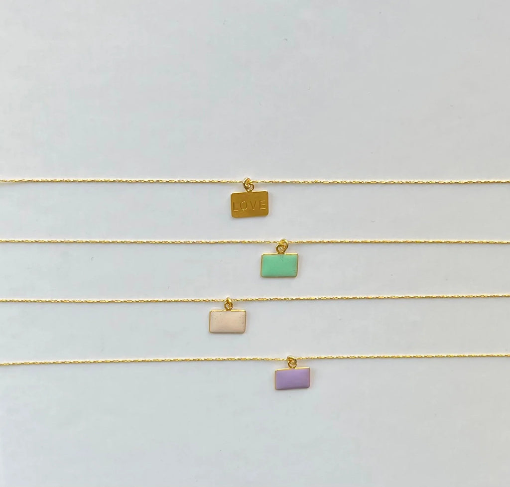 Ce collier plaqué or est orné d'une plaque extra-fine réversible, offrant deux styles en un. Portez l'inscription "LOVE" pour exprimer vos sentiments ou dévoilez l'autre face émaillée pour une touche colorée et élégante. Un accessoire versatile qui s'adapte à chaque humeur et occasion.