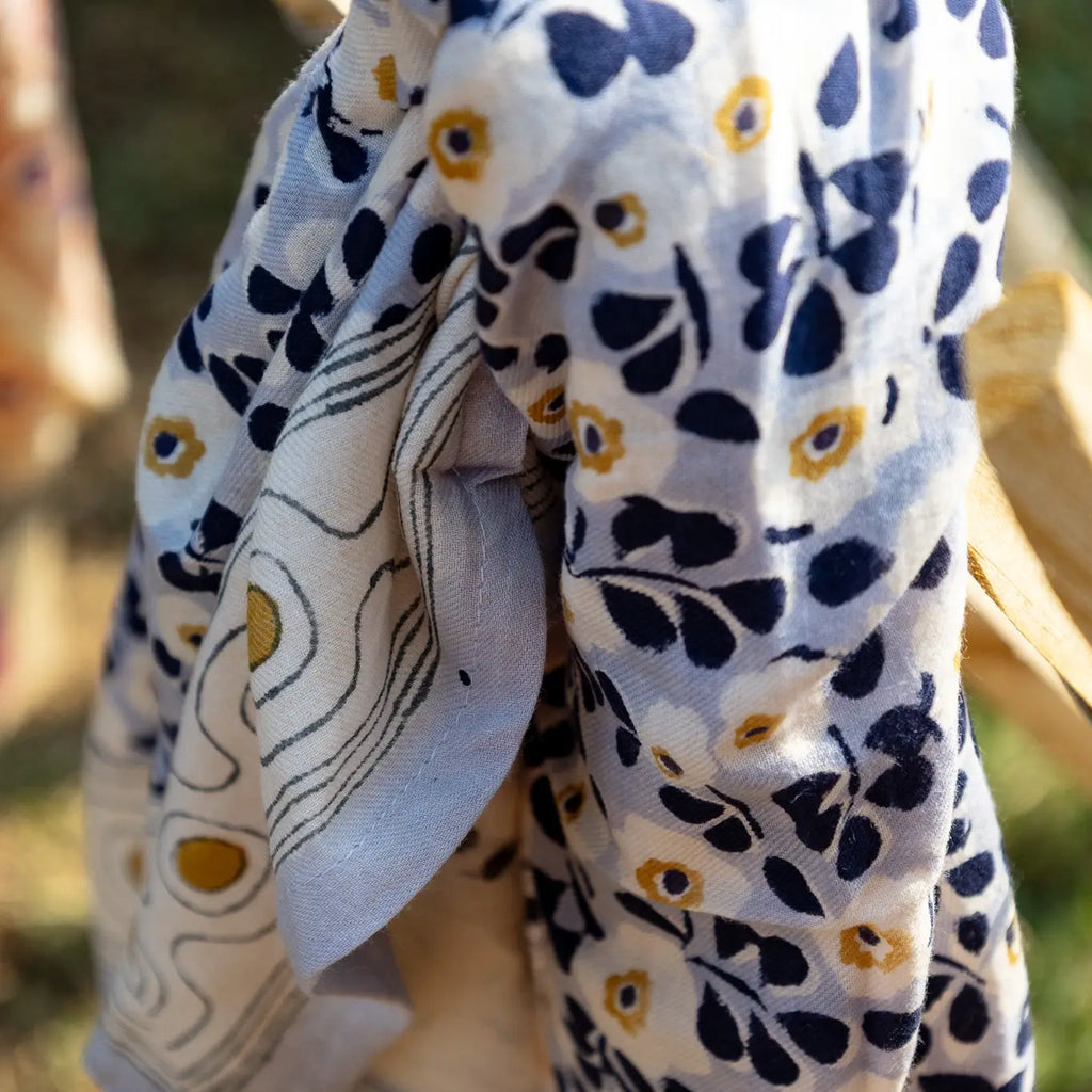Le foulard Fleurs Seventies combine un style rétro authentique avec un savoir-faire artisanal d’exception. Confectionné en 100 % coton et imprimé selon la technique traditionnelle indienne du block print, chaque foulard est une pièce unique. Ses motifs floraux aux couleurs chaudes, associés à des bordures graphiques, rappellent l’esprit libre des seventies. Grand et polyvalent, il s’adapte parfaitement à toutes vos envies : porté autour du cou, dans les cheveux ou comme accessoire de mode, il apporte une touche vintage élégante à chaque tenue.
