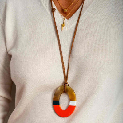 Découvrez ce magnifique pendentif ovale façonné dans une corne de buffle naturelle, sublimé par une laque colorée partielle qui en souligne l'élégance. Chaque pièce capture la beauté brute de la matière première, offrant un accessoire unique et authentique. Vous pouvez le porter sur le lien de votre choix : optez pour le lien réglable noir pour un style épuré, ou le lien naturel ajustable. Grâce à ses deux nœuds coulissants, l'ajustement se fait facilement pour un confort optimal au quotidien. Un pendentif intemporel qui accompagne vos envies de simplicité et de naturel.